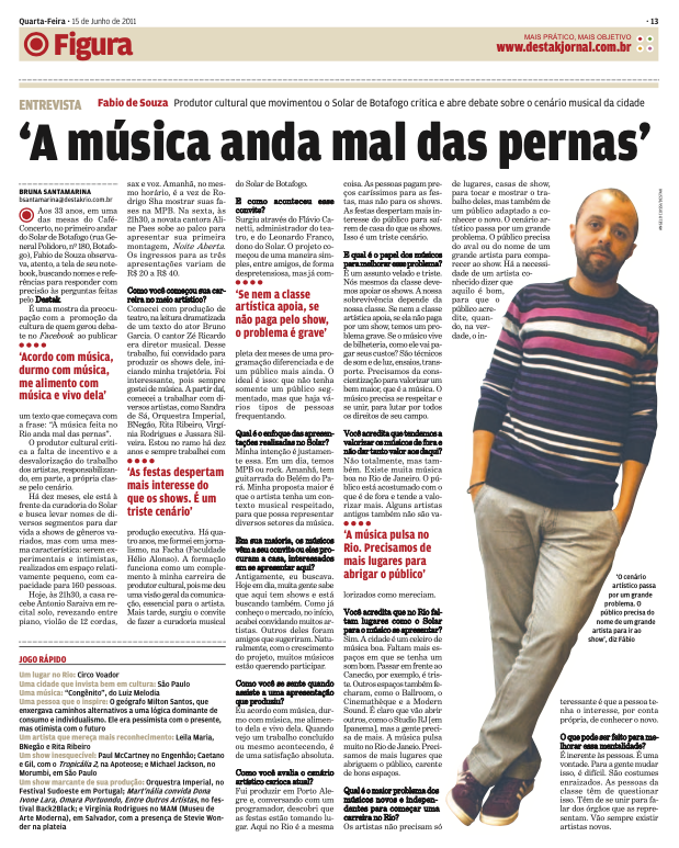 Entrevista para o Jornal Destak em 2011, perĂodo em que fui curador musical do teatro Solar de Botafogo RJ